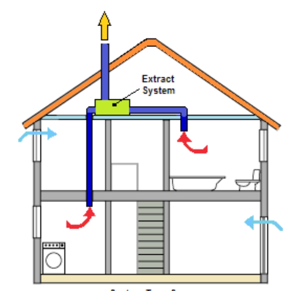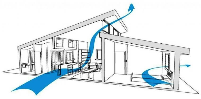 Lors de l'utilisation de la ventilation naturelle dans des maisons privées à deux ou trois étages, le plus gros problème est les volées d'escaliers, qui peuvent être considérées comme de grands conduits de ventilation. L'air déjà "épuisé" du premier étage monte dans les escaliers, ce qui signifie qu'il y aura une différence de température et d'humidité dans le bâtiment entre les étages inférieur et supérieur.