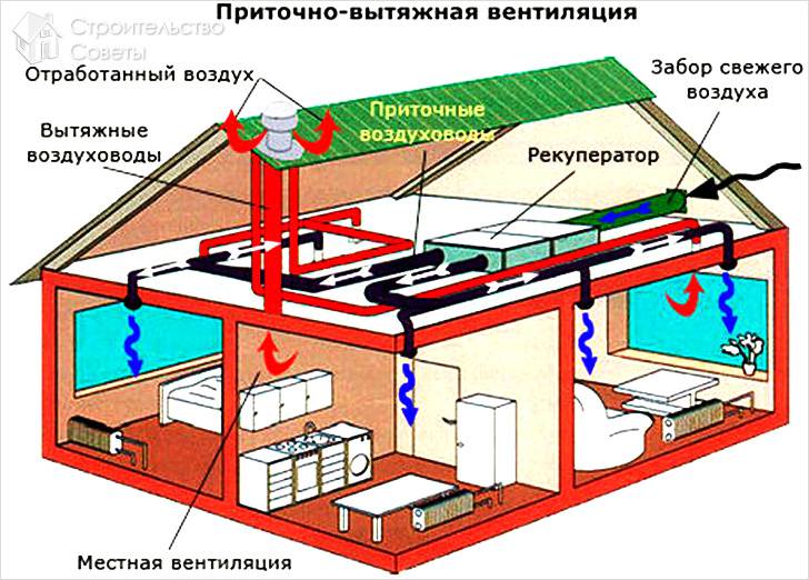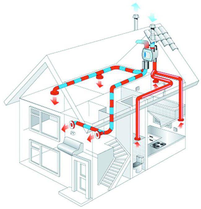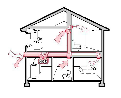 Deuxièmement, le deuxième étage n'est pas séparé du premier par des portes. Ensuite, dans chaque pièce, il devrait y avoir un canal pour l'entrée d'air frais et une sortie de ventilation. Et quelle que soit la destination de ces locaux.