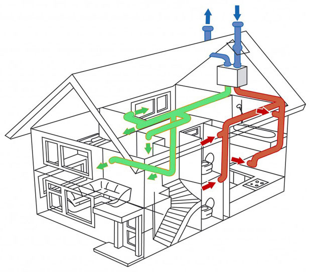 La ventilation d'alimentation et d'extraction avec récupération de chaleur est choisie par les propriétaires de maisons en panneaux SIP, qui souhaitent économiser beaucoup d'énergie. L'air pollué est aspiré à travers l'échangeur de chaleur. Cet appareil permet de chauffer l'air propre entrant à l'aide de l'énergie de l'air extrait.Ce type de ventilation mérite une attention particulière si la maison ne dispose pas de ressources énergétiques suffisantes pour chauffer l'air provenant de l'extérieur. La ventilation d'alimentation et d'extraction avec récupération de chaleur fonctionne mieux pendant la saison froide, ainsi que pendant le pic de la chaleur estivale. En hiver, il réduit les pertes de chaleur et en été, il donne de la fraîcheur.