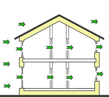 La ventilation dans un bâtiment résidentiel à ossature est une nécessité. Il convient de tenir compte de son agencement au stade de la construction du bâtiment. Dans une maison non ventilée, il y a une forte probabilité d'apparition de bactéries et de champignons et de décomposition des pièces structurelles et du câblage.