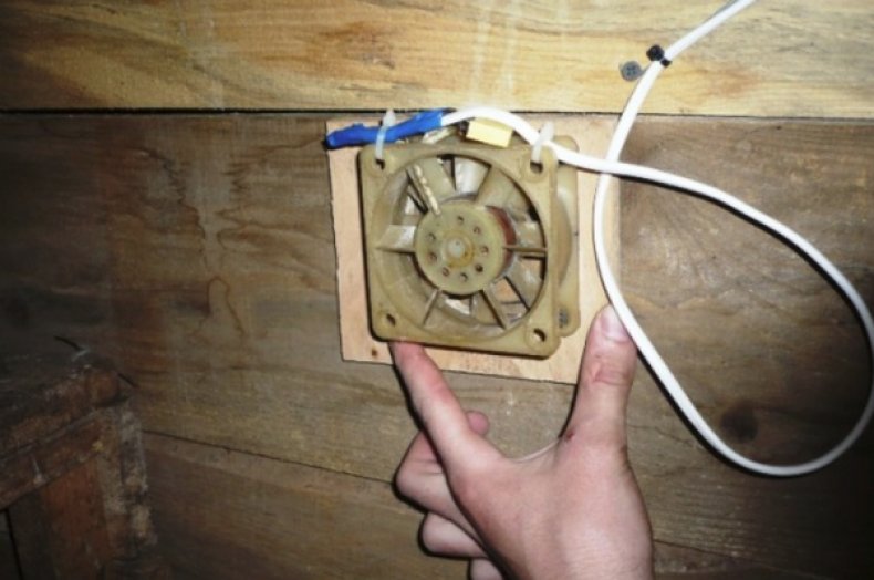 - Nous insérons le ventilateur dans le trou et le fixons de nos propres mains de manière accessible (selon sa conception). À l'aide d'un câble et d'une pince, nous connectons le ventilateur au secteur et à l'interrupteur. Nous apportons l'interrupteur à l'extérieur de la grange et le plaçons dans un endroit qui vous convient. Nous isolons soigneusement les lieux de sertissage des fils.