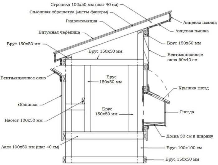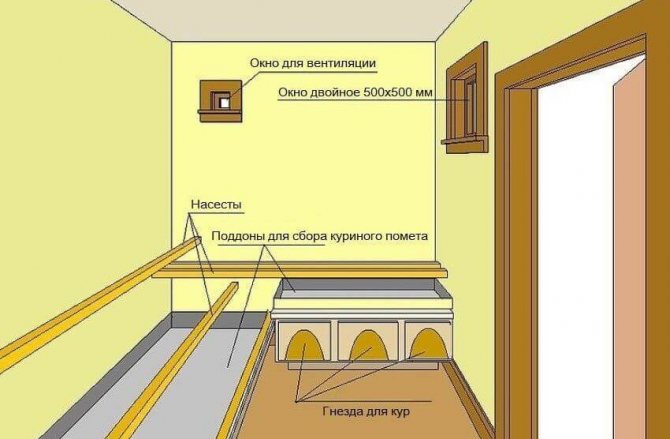 Fournir un microclimat optimal joue un rôle important. Pour ce faire, il est nécessaire de placer commodément des perchoirs et des nids. Des exemples d'équipements intérieurs de poulailler sont présentés à la figure 1.