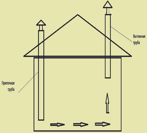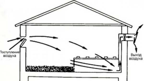 Par conséquent, lors de la conception de la ventilation, il est nécessaire d'extraire l'air «sale» du dessous du poulailler. Naturellement, pour qu'il y ait tirage, l'entrée doit être située en diagonale par rapport à l'ouverture d'échappement (en haut ?). Et c'est exactement l'antiphase de la ventilation naturelle. Un ventilateur ou tout autre dispositif à flux forcé résout le problème.