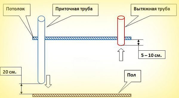Les tuyaux sont installés dans les coins opposés de la pièce afin que le flux d'air couvre la plus grande surface possible.