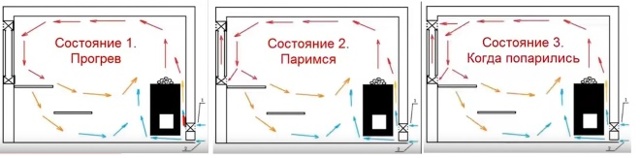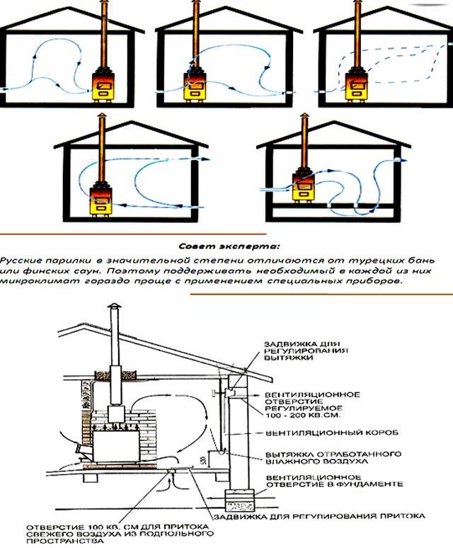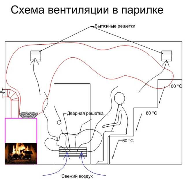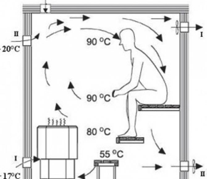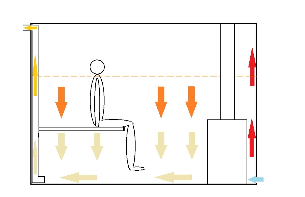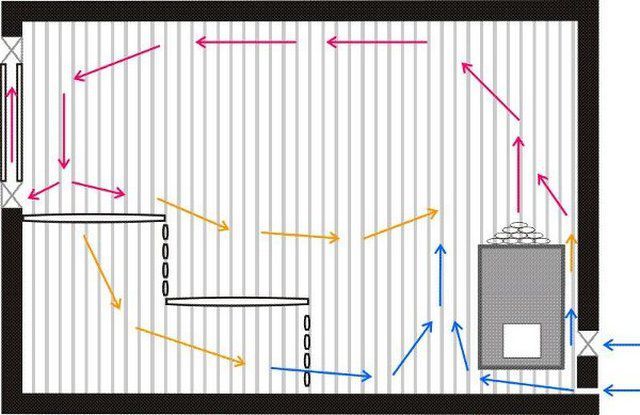 Ventilation optimale dans le hammam du bain russe, si le foyer est situé dans le hammam.Dans ce cas, les flux chauds sont éliminés par la fournaise dans la cheminée et un flux frais pénètre par la fenêtre, des fissures dans le sol ou sous la porte.