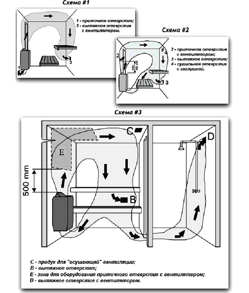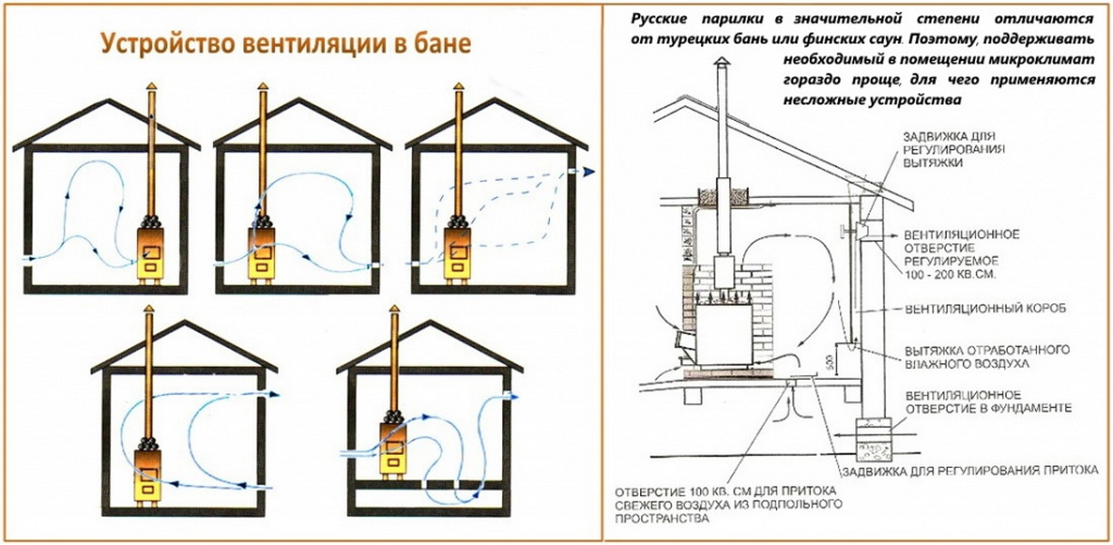 Il existe de nombreux schémas, mais chacun convient à la compréhension du principe de la ventilation. Le plus souvent, des schémas de ventilation pour le hammam sont proposés, mais le schéma pour l'ensemble du bain, avec des explications, présente un intérêt beaucoup plus grand.