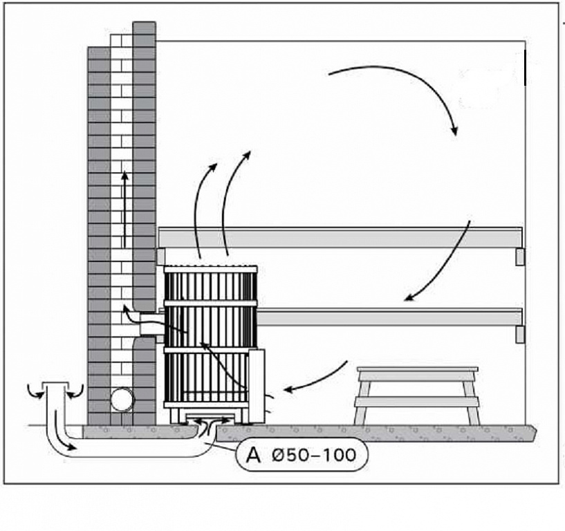 L'emplacement idéal de l'arrivée d'air se situe derrière la fournaise. En entrant dans la pièce, il commence immédiatement à se réchauffer, déplaçant la masse d'air déjà chaude vers le haut et vers la hotte. Par conséquent, des courants froids et des niveaux avec des températures sensiblement différentes ne se forment pas dans le hammam.