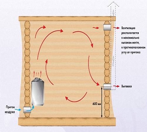 Cette méthode de ventilation dans un hammam n'est pas la plus fiable et la plus efficace, car la majeure partie de l'air frais est immédiatement aspirée dans le poêle.Par conséquent, même lors de la construction de la baignoire, il est conseillé d'envisager d'autres options avec l'installation de produits dans les murs.