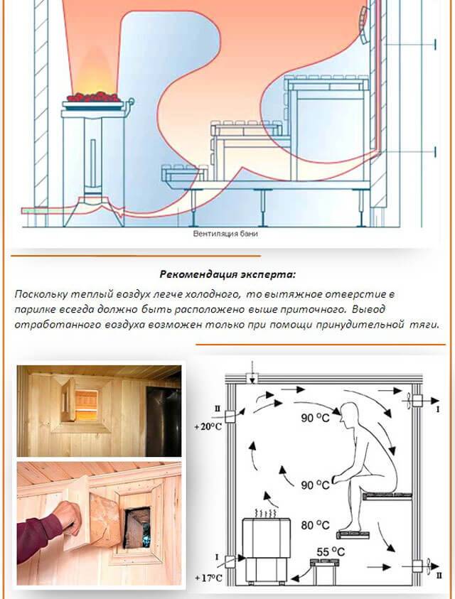 Pour commencer, considérons les classiques - l'alimentation naturelle et la ventilation par aspiration. La loi de hotte de ce type est l'emplacement correct des ouvertures d'entrée et de sortie. Le bon est lorsque l'entrée est située près du poêle ou en dessous (si nous parlons de la version électrique), tandis que la sortie est située du côté opposé. De plus, l'air frais et froid entrera dans le hammam par un espace spécialement laissé de 5 à 7 cm sous la porte.