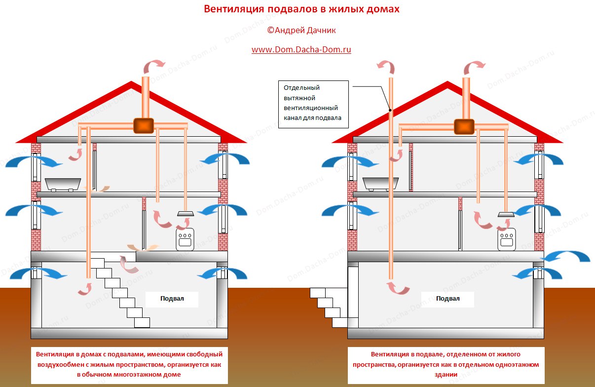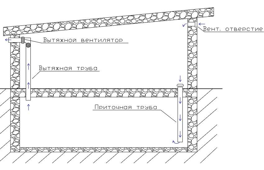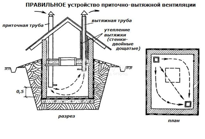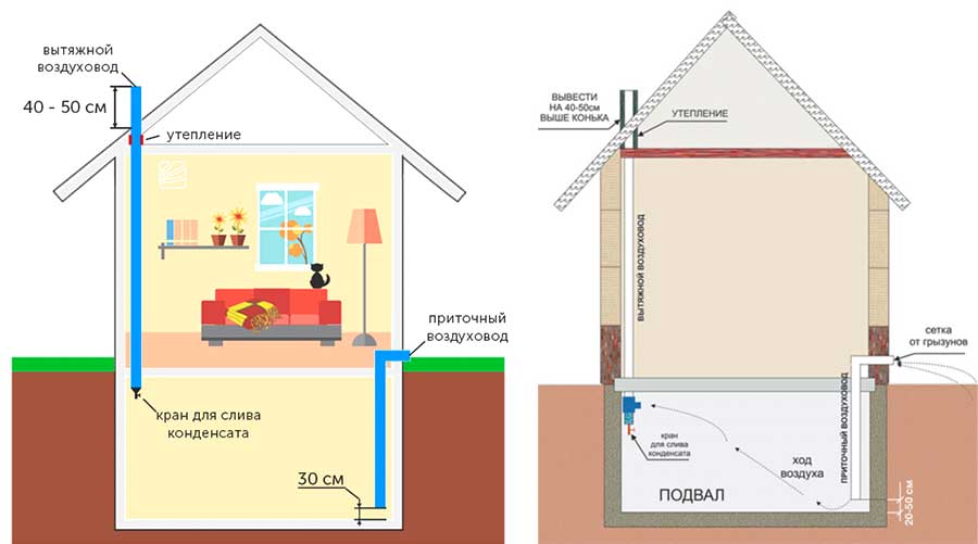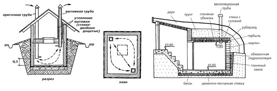 Le schéma de ventilation dépend des paramètres de la maison, de la destination du sous-sol et de l'emplacement avec des caractéristiques climatiques. Pour équiper un système conventionnel, vous aurez besoin de deux tuyaux (un pour l'alimentation, le second pour l'évacuation), qui seront responsables de la circulation de l'air dans le stockage.