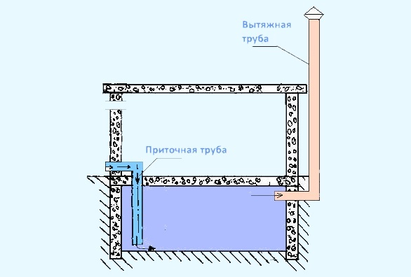- Nous déterminons l'emplacement des ouvertures des tuyaux d'alimentation et d'évacuation au sous-sol. Ils doivent être placés en diagonale dans différents coins du plafond ou en haut du mur. Dans le même temps, le tuyau d'alimentation doit aller du côté nord du garage et le tuyau d'échappement - vers le toit ou vers le sud.