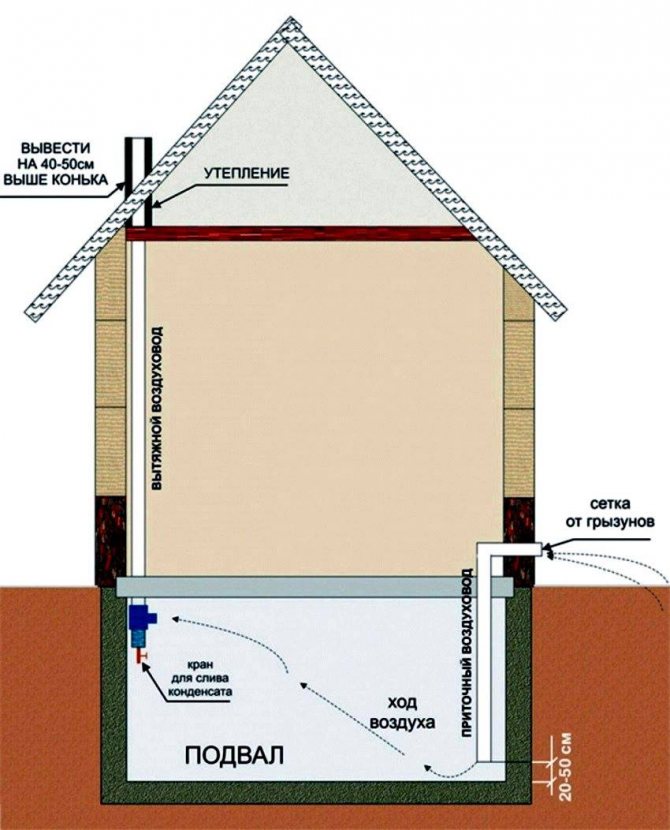 Avec une petite surface du sous-sol, pour assurer l'échange d'air, faites de petits canaux (prises d'air) situés sur des murs opposés au sous-sol des bâtiments.