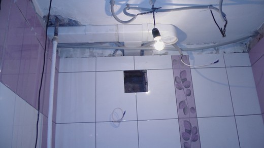 Un trou est fait dans le plafond de la salle de bain d'une maison privée, égal au diamètre du tuyau isolé. L'extrémité supérieure du tuyau d'échappement est insérée dans l'ouverture pratiquée dans le toit et l'extrémité inférieure est insérée dans la fenêtre de ventilation découpée dans le plafond.