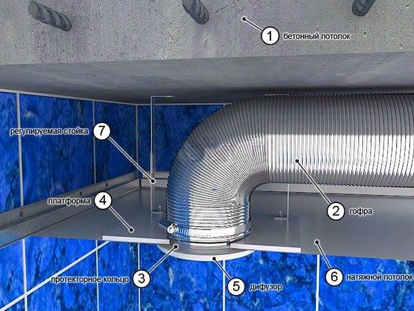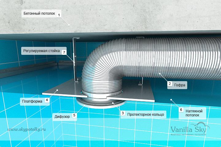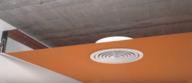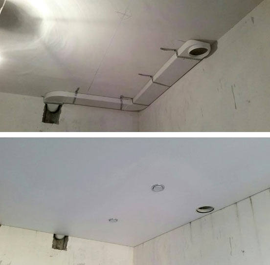 La première étape comprend le placement obligatoire du conduit. Il est réalisé avant la fixation d'un plafond tendu ou suspendu. Le canal supplémentaire de ventilation a deux extrémités. L'un est inséré dans le puits de ventilation, l'autre est relié à l'appareil. En même temps, il doit être amené au ras du futur plafond tendu ou suspendu.
