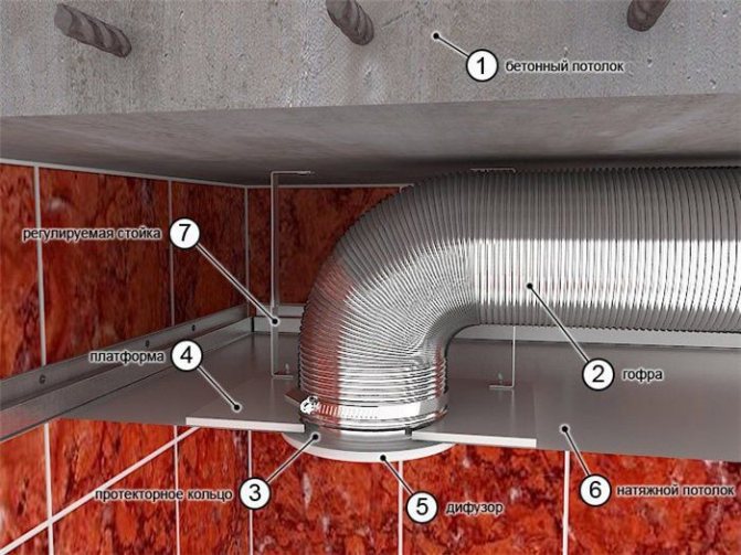 Le conduit d'air peut être en matériau rigide (PVC) ou en ondulation souple. Dans le premier cas, le conduit de ventilation est fixé au plafond avec des supports en plastique spéciaux. Dans le second cas, il suffit d'étirer le tuyau de l'arbre à l'emplacement de l'appareil.