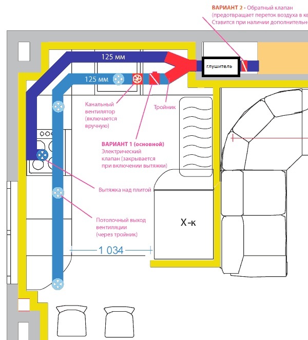 Selon l'emplacement de la ventilation d'extraction, un modèle de vanne horizontale ou verticale et un ventilateur avec une performance suffisamment élevée sont utilisés (+)