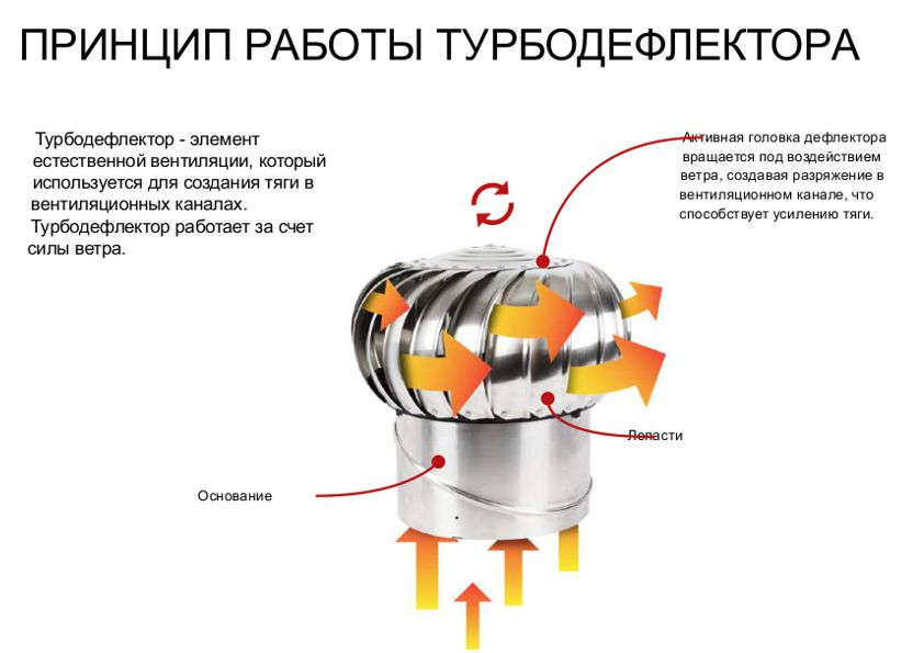 Si l'on considère les dessins des déflecteurs turbo, on peut prêter attention au fait que la caractéristique distinctive des dispositifs est la forme sphérique des dispositifs rotatifs avec des pales en forme de demi-cercles qui tournent sous l'influence de la force du vent. Dans ce cas, de l'air raréfié, qui augmente l'efficacité de la hotte, se forme à l'intérieur de la sphère au-dessus de la tête du tuyau.