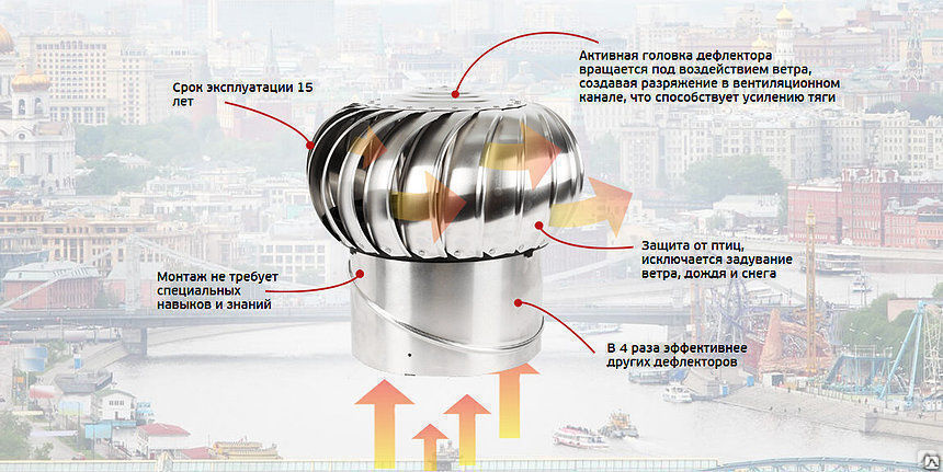 Ce type de déflecteurs multiplie par quatre le travail du système d'alimentation et d'échappement naturel, et en même temps, un tel déflecteur ne nécessite pas de connexion à l'électricité.