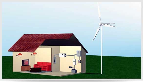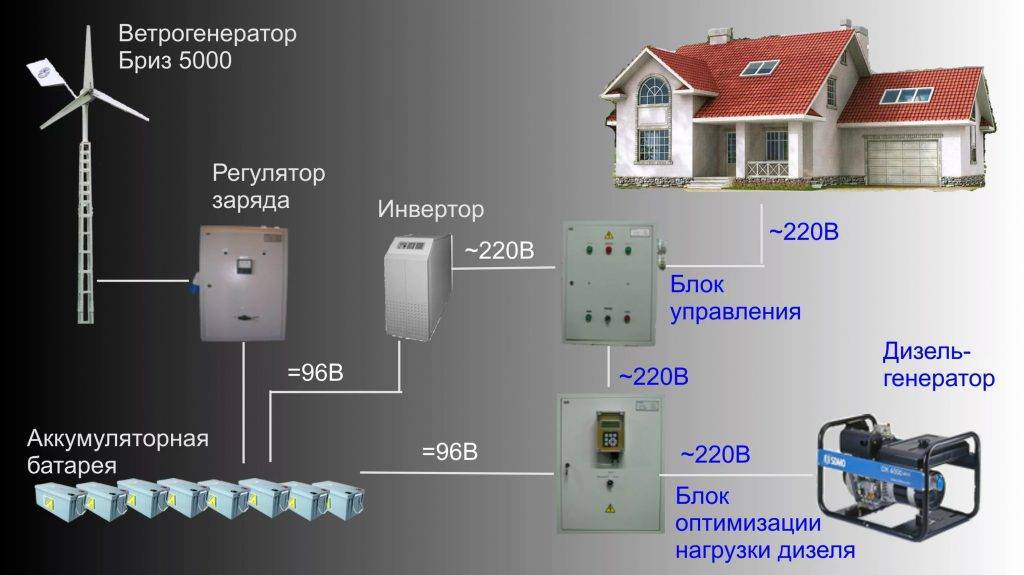 Pour une maison privée de résidence permanente, ce principe ne fonctionnera pas. Lorsqu'il n'y a souvent pas de vent, une attention particulière doit être portée à l'accumulateur.Cela nécessite une grande capacité. Cependant, pour qu'il se charge plus rapidement, le générateur d'électricité lui-même doit également être de grande puissance. C'est-à-dire que les nœuds individuels de l'installation sont étroitement interconnectés les uns avec les autres. Une combinaison plus fiable est une symbiose avec un générateur diesel et des panneaux solaires. C'est une garantie à 100% de la disponibilité de l'électricité dans la maison, mais aussi plus chère.