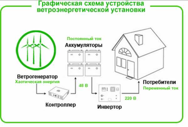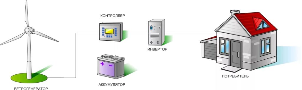 En général, dans les conditions du climat russe avec de longs hivers froids et des vitesses de vent relativement faibles, le schéma le plus économe en énergie et le moins cher est une éolienne à axe de rotation vertical installée au niveau du sol ou sur un petit mât de 5 à 10 m haut, l'élevant au-dessus du toit de la maison et couronne les arbres fruitiers. L'éolienne est directement connectée à un radiateur électrique séparé et à une chaudière à l'intérieur, sans convertisseurs de courant ni batteries.