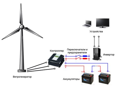 Le kit peut comprendre : 1 - l'éolienne elle-même, 2 - le mât, 3 - la fondation, 4 - la batterie, 5 - l'onduleur, 6 - le contrôleur, ainsi que les câbles, les connecteurs, le rack, le générateur diesel et les autres consommables nécessaires pour installation