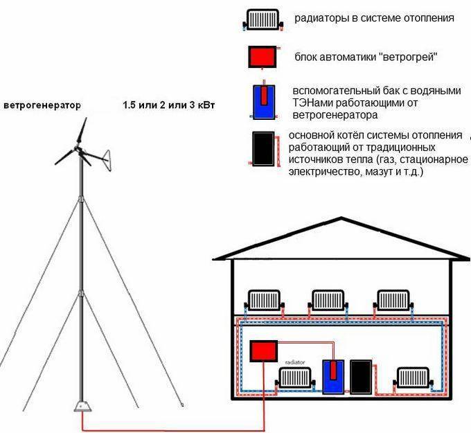 Pour un climat avec un long hiver, les modèles à rotor vertical conviennent mieux. Vous pouvez installer un tel appareil au sol ou sur un mât bas. De plus, il peut être directement raccordé au réseau électrique avec un réchauffeur et une chaudière. Dans ce cas, vous pouvez essayer de vous passer d'onduleur et de batteries. Le plus souvent, un tel schéma de connexion peut être mis en œuvre de vos propres mains sans l'intervention d'organisations tierces. Une telle éolienne peut servir à fournir de la chaleur.