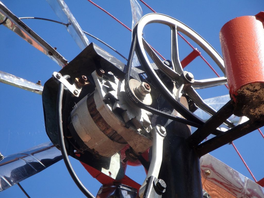 - Connectez le rotor au générateur. À l'aide d'une perceuse, des trous sont percés dans le fond du réservoir et la poulie du générateur. Ils doivent être symétriques afin qu'un déséquilibre ne se produise pas lors du mouvement des pales.Fixer le conteneur avec les pales au générateur (poulie) avec des boulons de diamètre approprié.