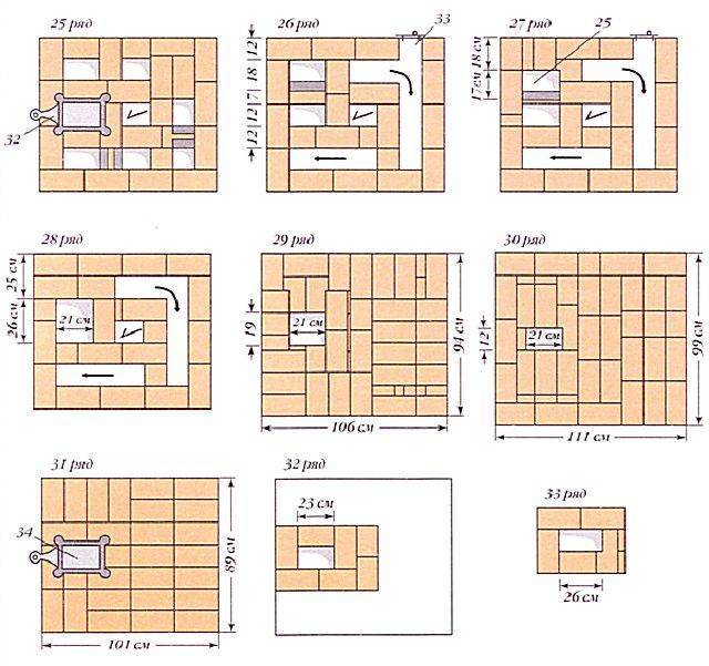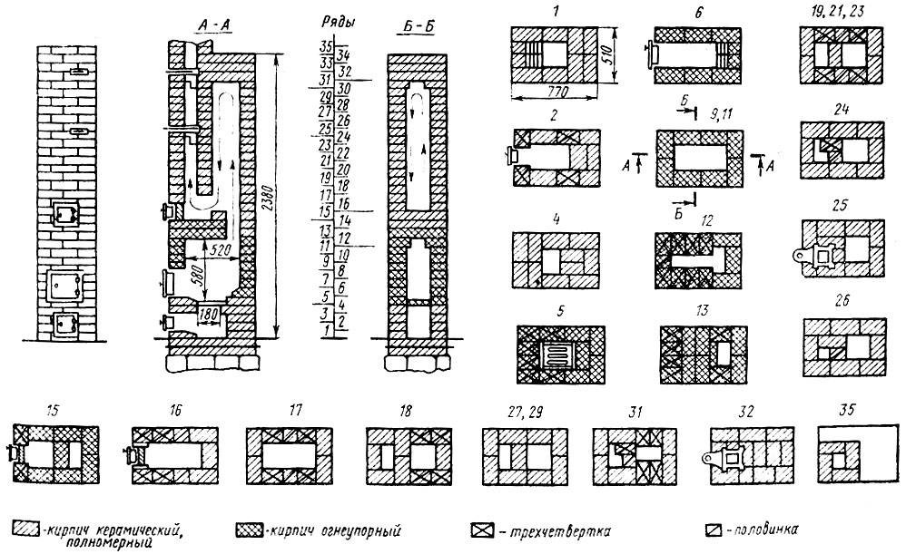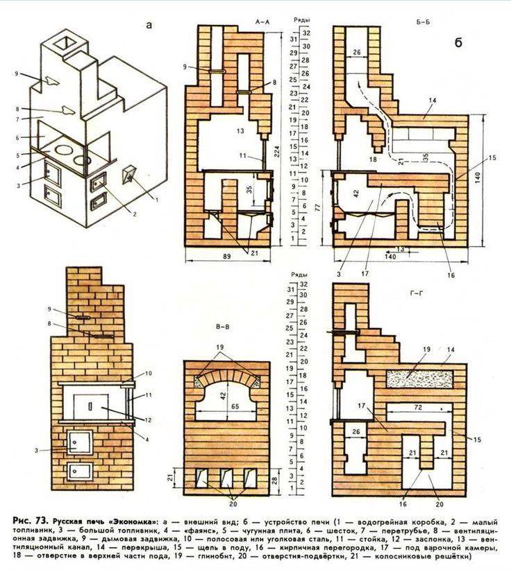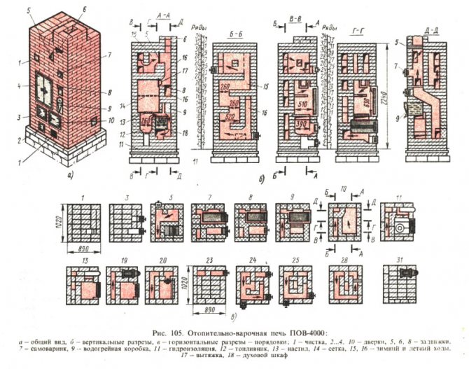 Les conceptions traditionnelles se distinguent par la présence d'une partie inférieure non chauffée, un sous-four creux, où l'on peut ranger les ustensiles et une réserve de bois de chauffage. Le four moderne est plus fonctionnel, la partie inférieure est en brique et est un canal, il chauffe bien. Pour la partie supérieure, une plaque de cuisson en fonte est généralement montée, une grille de cuisson, ce qui rend la conception adaptée à la cuisson de divers plats.