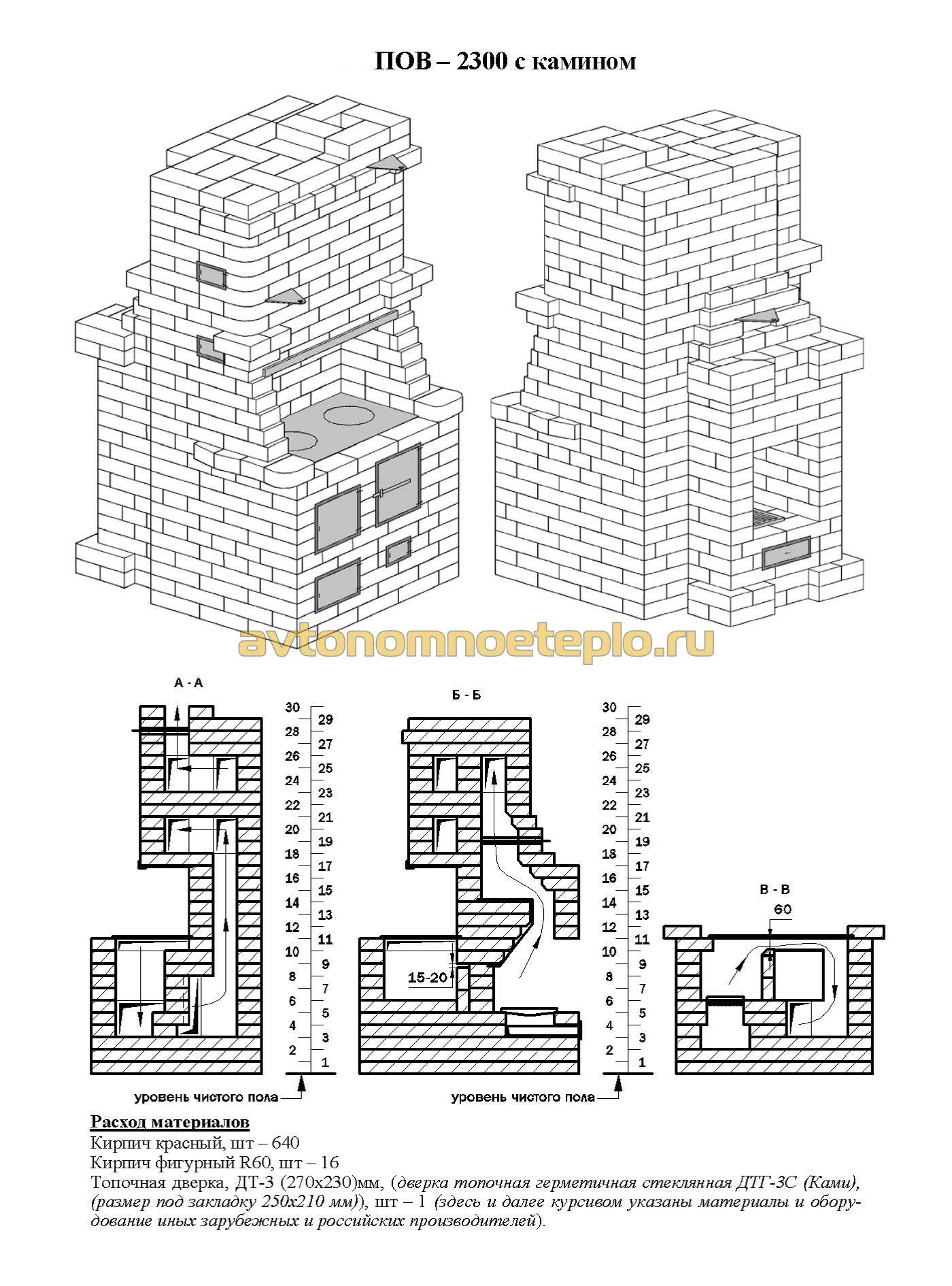 Un four en brique bien construit diffuse une chaleur douce et saine sans odeur de poussière brûlée. Il convient à une habitation temporaire ou permanente et est capable de chauffer un bâtiment d'un étage. Si le domaine compte plus de 3 pièces, en plus du chauffage et de la cuisinière, un autre poêle doit être construit - un poêle de chauffage. Dans un chalet de 2 étages, un chauffage et une cuisinière sont disposés au premier niveau, et un chauffage-poêle au second. Les foyers peuvent être séparés ou 1 chambre de combustion commune peut être installée au rez-de-chaussée, et le bouclier chauffant peut être placé sur 2 niveaux.