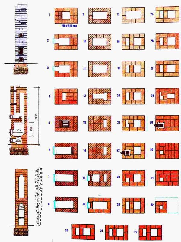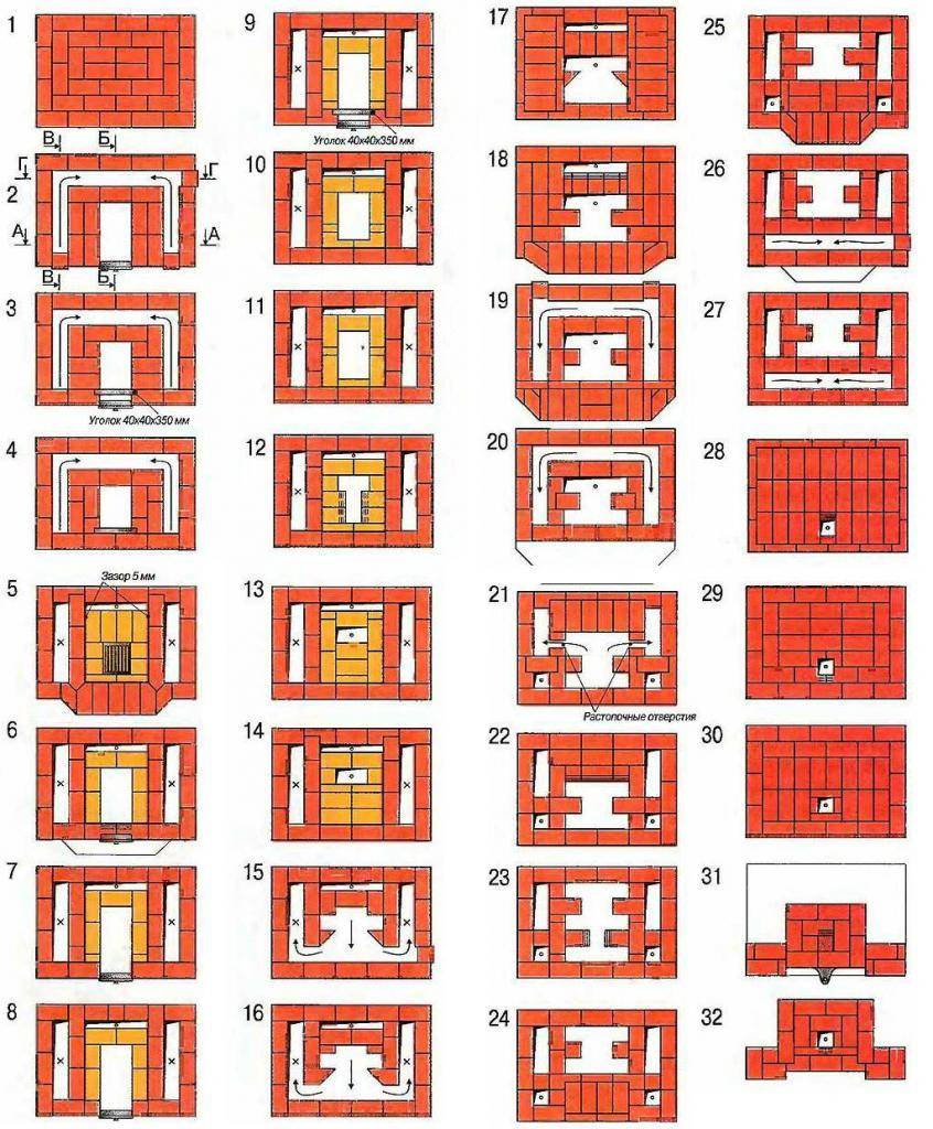 Pour la pose du four, il est nécessaire d'acheter 2 types de briques: céramique solide ordinaire et argile réfractaire (réfractaire), à partir desquelles la chambre de combustion, les canaux de fumée et tous les éléments chauffants seront pliés