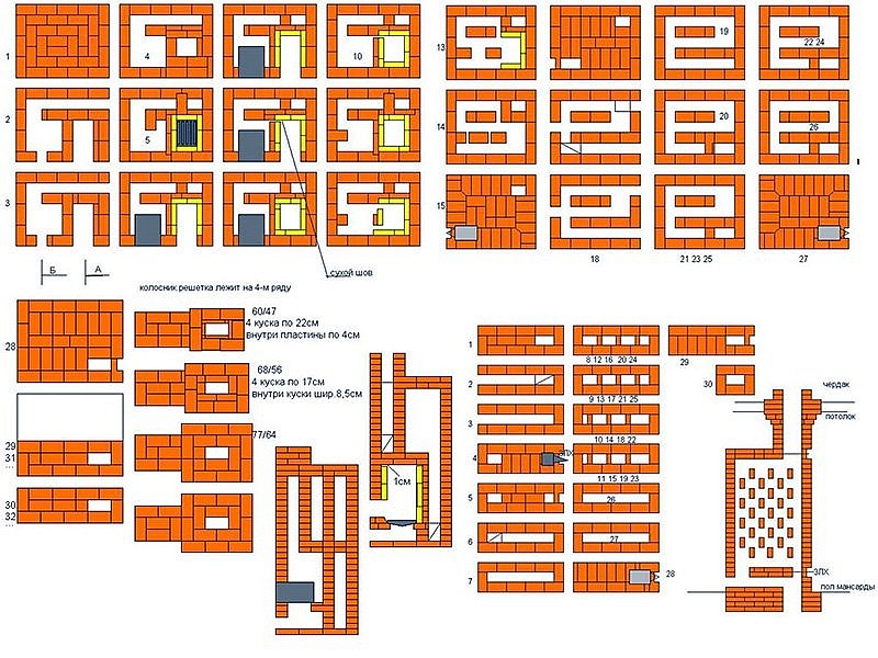 - Dès que plusieurs rangées sont disposées, une grille est installée au-dessus du cendrier. Il est posé sur des briques en argile réfractaire ;