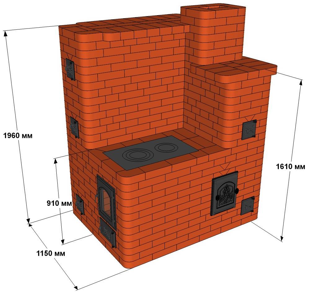 Avec des dimensions insuffisantes de la chambre de combustion, un faible transfert de chaleur est observé. La largeur dépend du transfert de chaleur requis: jusqu'à 1 000. kcal - 12 cm, jusqu'à 3 000 - 27 cm, si plus - jusqu'à 50 cm Pour plus de commodité, les dimensions de la chambre de combustion sont considérées comme des multiples d'une brique. La longueur est faite de 26 cm à 51 cm, la plus longue est destinée au bois de chauffage. Le carburant utilisé affecte la hauteur : 6–15 rangs (42–100 cm). La grille est posée une ou deux rangées sous la porte afin que les braises ne tombent pas. Souvent l'arrière est incliné plus haut que l'avant pour une meilleure combustion.