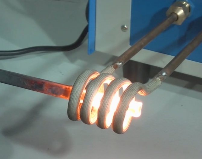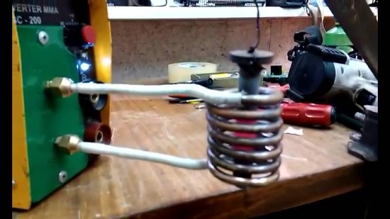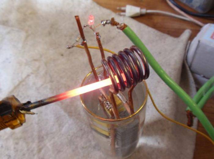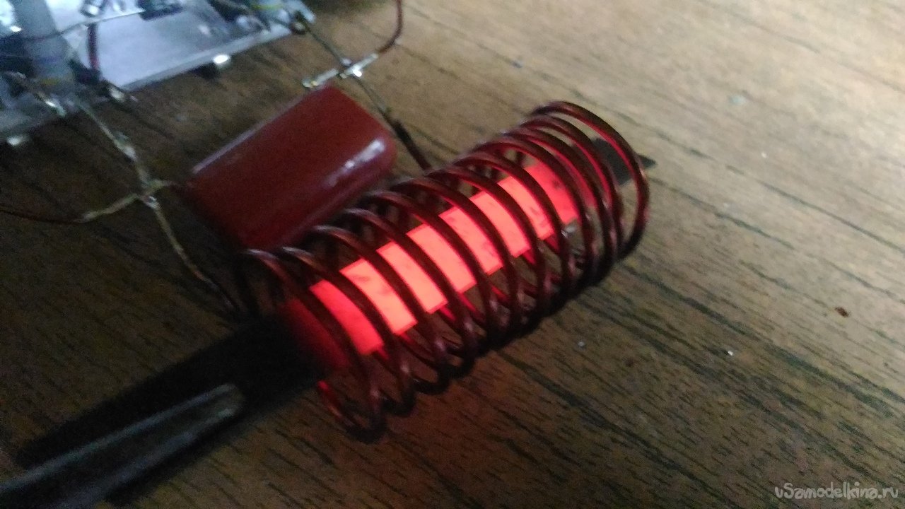 3. Le chauffage du métal se produit à l'intérieur de la bobine, après que le circuit est connecté à une alimentation ou à une batterie. Lors du chauffage du métal, il est nécessaire de s'assurer qu'il n'y a pas de court-circuit des enroulements du ressort. Si vous touchez le métal chauffé 2 tours de la bobine en même temps, les transistors échouent instantanément.