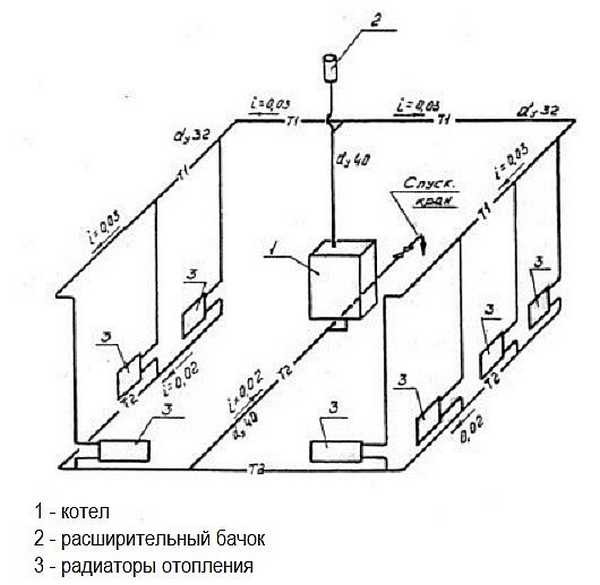 On note tout de suite qu'il ne sera pas possible de scinder la "Leningradka" en 2 branches. Cela signifie que la canalisation annulaire passera nécessairement sous le seuil de la porte d'entrée. Pour résister à toutes les pentes, la chaudière devra être placée dans une fosse.