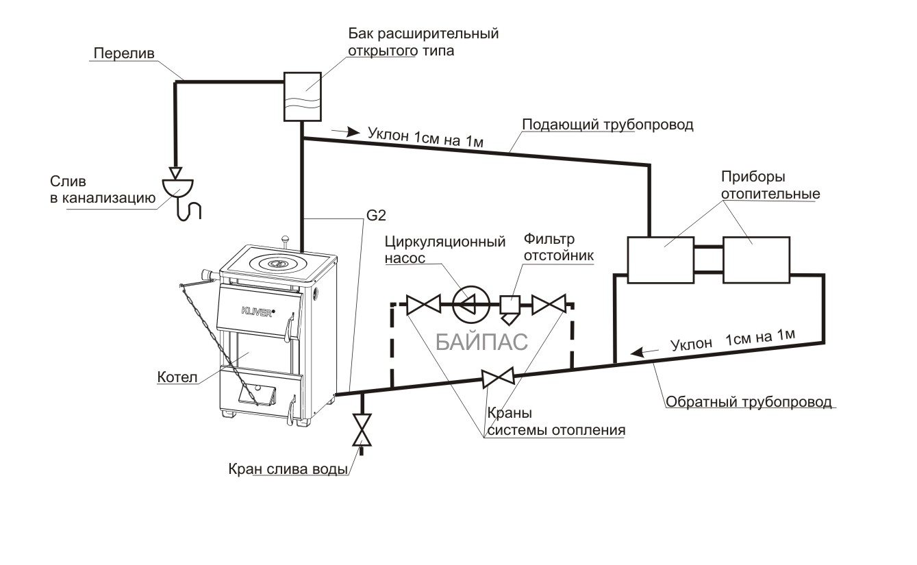 L'ensemble du circuit doit être fermé au même endroit où il a commencé - sur la chaudière. Un filtre spécial et (si nécessaire) une pompe de circulation sont installés à l'entrée de la chaudière. Le point le plus bas du système doit être équipé d'une unité de remplissage/vidange, nécessaire pour vidanger toute l'eau en cas de travaux de réparation.