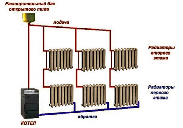 - L'emplacement bas des tuyaux de chauffage - ils peuvent être montés au niveau du sol ou même abaissés sous les sols (cela peut augmenter la résistance hydraulique et nécessiter l'utilisation d'une pompe de circulation).