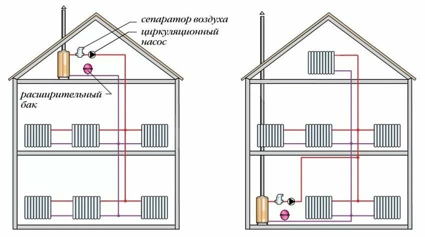 Le principe de fonctionnement du système est assez simple: l'eau est chauffée dans la chaudière et passe par des tuyaux jusqu'aux radiateurs.À travers eux, elle dégage de la chaleur puis retourne à la chaudière par un circuit différent. L'une des tâches principales du système de chauffage est de démarrer l'eau et de la faire circuler dans les tuyaux. Ceci est mis en œuvre de l'une des deux manières suivantes : naturelle et forcée. Dans le premier cas, l'eau se déplace selon les lois de la physique, lorsque l'eau froide est déplacée par l'eau chaude. Dans le second cas, le mouvement de l'eau est démarré à l'aide d'une pompe de circulation.