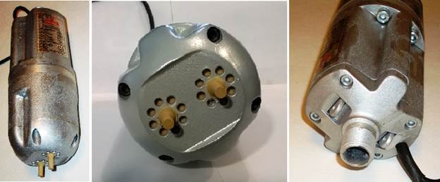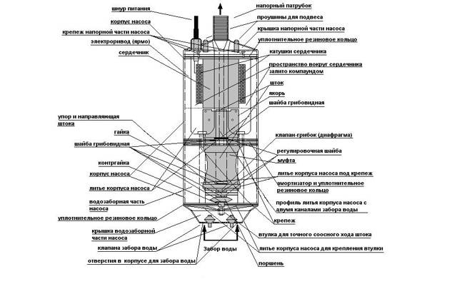 Le modèle appartient aux unités de vibration submersibles. Traditionnellement, pour ce type d'équipement de pompage, le corps de l'appareil est divisé en deux chambres - la première est conçue pour le moteur et la bobine magnétique, la seconde, réalisée sous la forme d'un cylindre, sert de compartiment de pompe, a une ancre et des pistons intégrés.