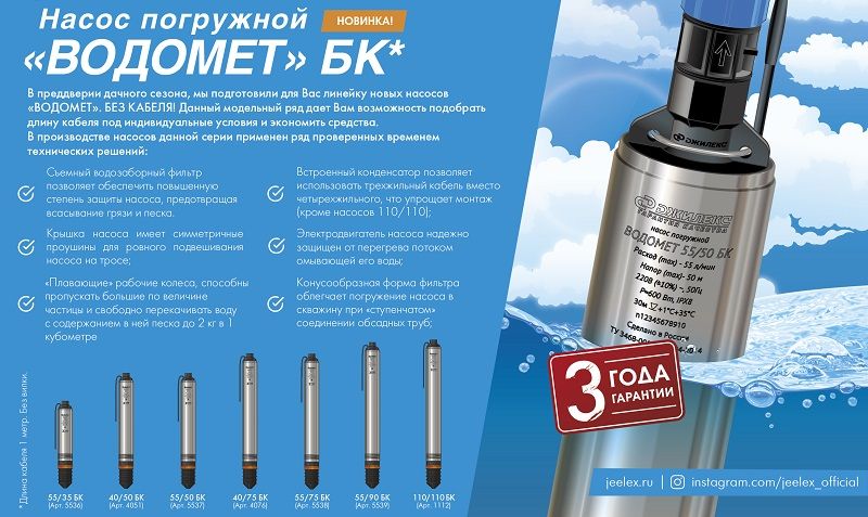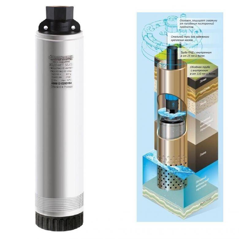 Les pompes de la série Vodomet sont descendues dans le puits, suspendues à un câble solide, auquel un câble d'alimentation et un tuyau sont fixés sur les côtés pour soulever l'eau. La corde est solidement fixée au sommet.