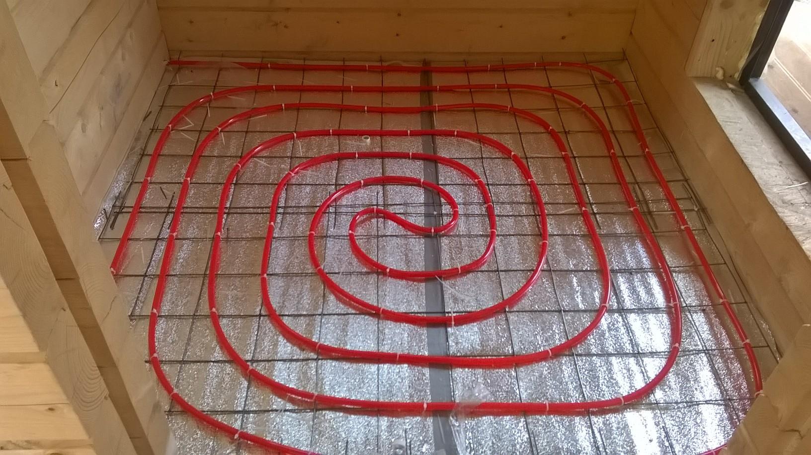 Si la pièce à côté des murs extérieurs doit être chauffée plus intensément, il est possible d'y poser des tuyaux chauds, situés en boucles, qui sont parfois situés presque à angle droit les uns par rapport aux autres.