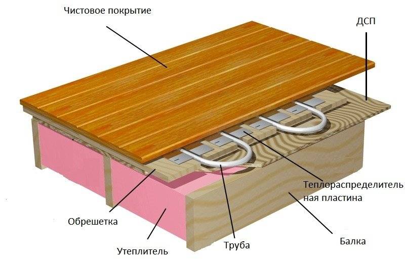 technologie sèche. Dans ce cas, le système de chauffage est posé sur des plaques de bois ou des tapis de polystyrène dans des canaux spécialement conçus. Des feuilles de contreplaqué ou de GVL sont posées sur le système. Le revêtement de sol est installé sur le dessus. Soit dit en passant, vous ne devez pas vous allonger sur le panneau de particules ou le système OSB, car ils contiennent des substances qui, sous l'influence de températures élevées, commencent à s'évaporer et à affecter négativement le corps humain.