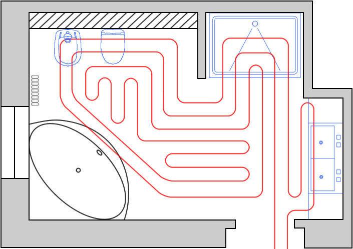 Les bobines de la spirale couvrent uniformément toute la pièce, dégageant de la chaleur de manière également active sur toute la surface du sol. Le tuyau représenté en bleu sur le schéma, qui évacue l'eau refroidie, traverse également la pièce.