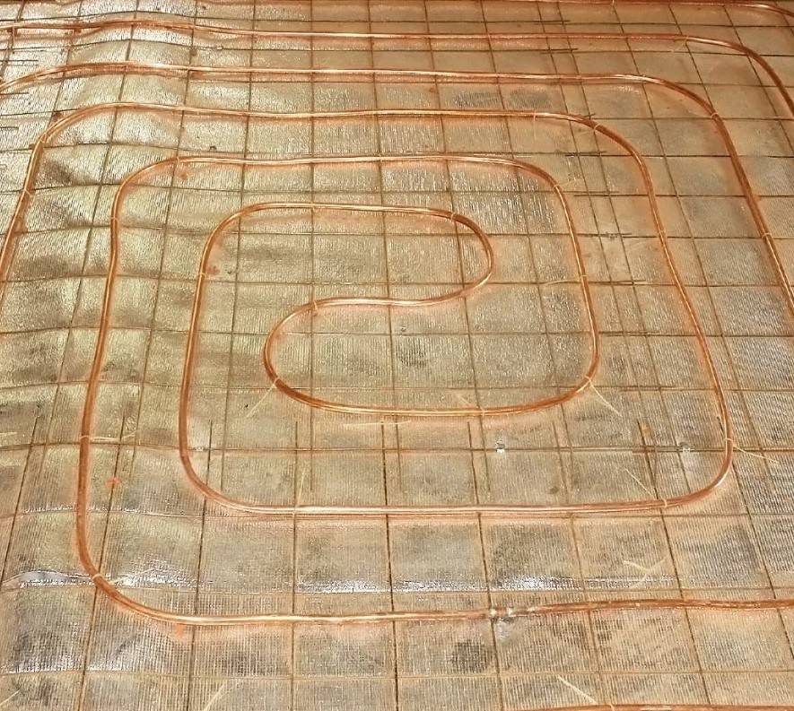 Lorsqu'une installation en forme d'escargot est utilisée, les tuyaux par lesquels l'eau chaude est fournie à la pièce, et ceux par lesquels l'eau refroidie revient, sont placés sur toute la surface de la pièce et sont parallèles les uns aux autres.