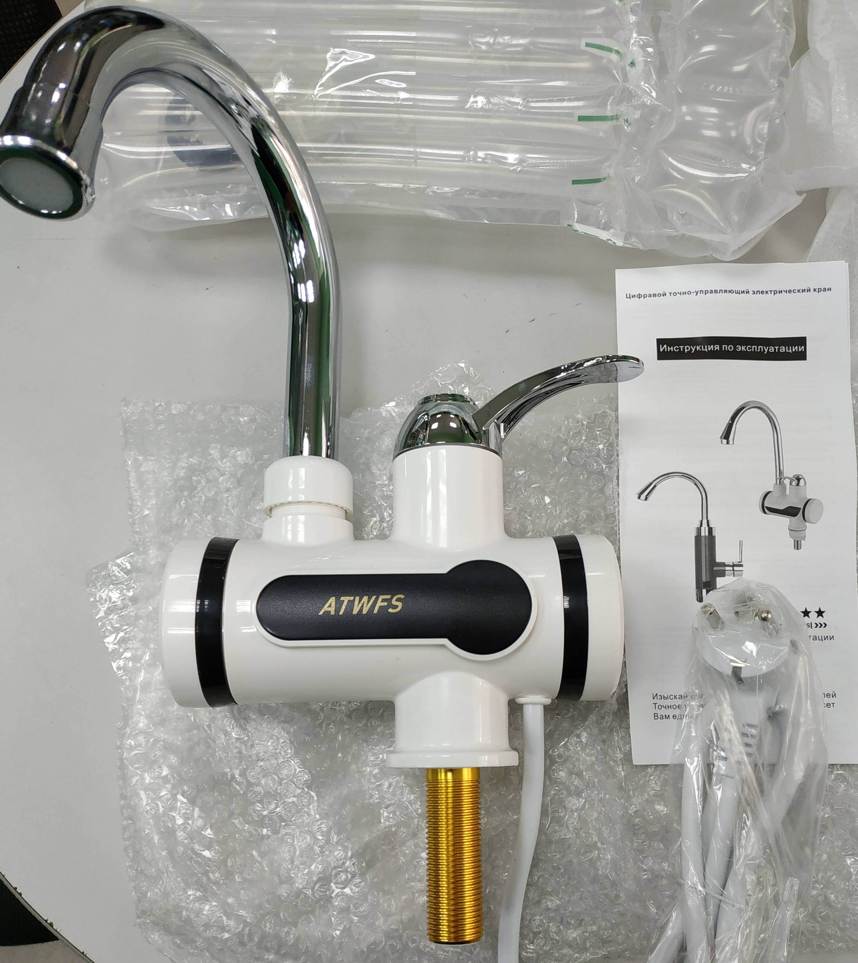 Considérez la méthode d'installation sur l'exemple du modèle Aquatherm. Dans l'emballage, en règle générale, il y a une buse sur le robinet lui-même et le mélangeur lui-même, ainsi qu'une carte de garantie, un mode d'emploi et des spécifications techniques. L'appareil fonctionne à partir d'une tension de 220 V, ce qui vous permet de connecter l'appareil directement à n'importe quelle prise.