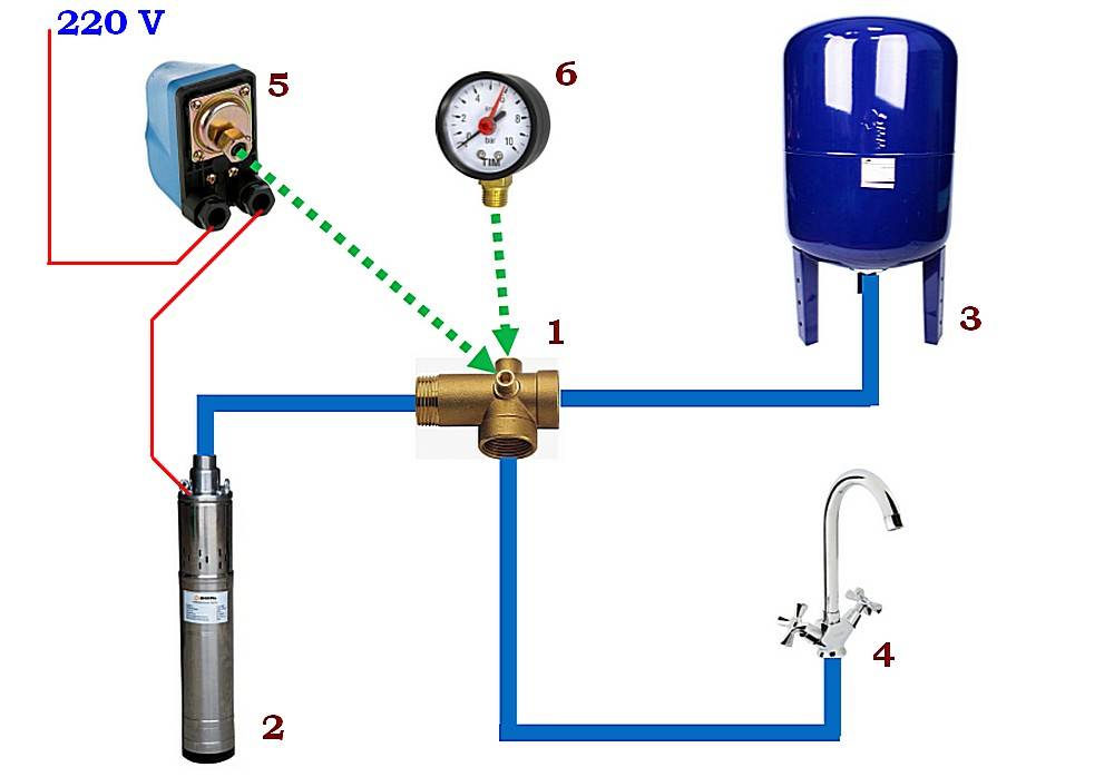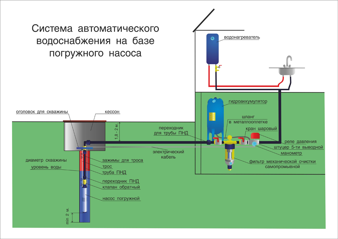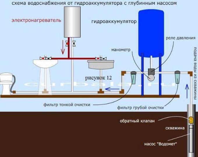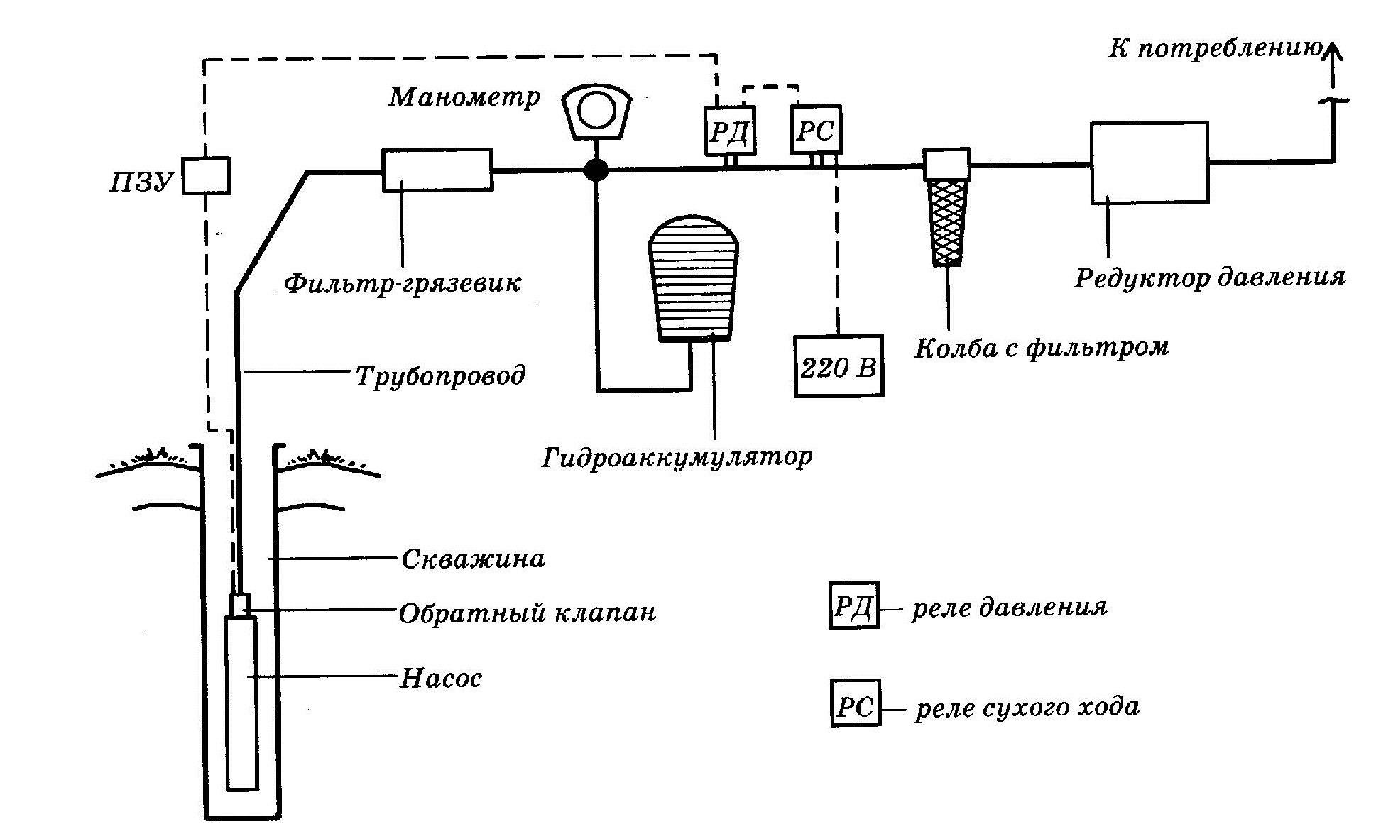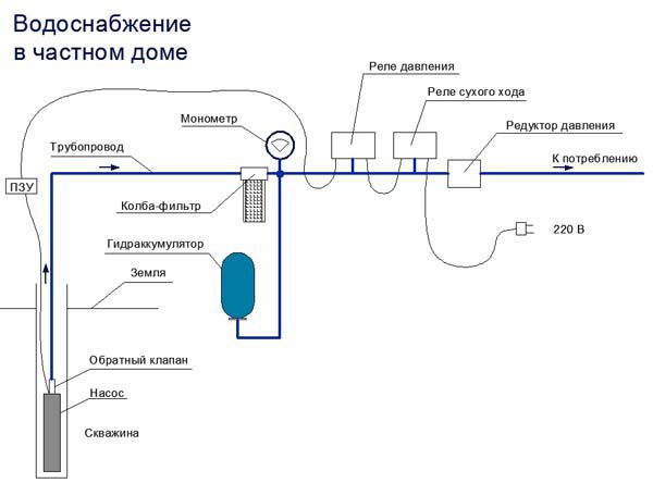 Tout système d'alimentation en eau se compose d'un puits, d'une pompe, d'un accumulateur hydraulique pour protéger la pompe. Et si désiré, un filtre ou plusieurs filtres avant ou après l'accumulateur.