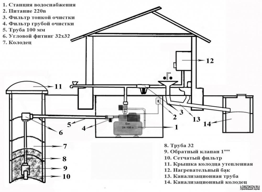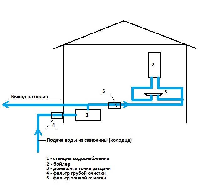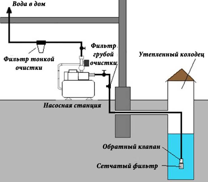 De la source, l'eau est pompée par une station de pompage, qui est généralement située au sous-sol, au 1er étage ou au sous-sol. Il est conseillé de placer la station dans une pièce avec chauffage afin que le système d'alimentation en eau fonctionne en hiver. Un raccord est placé sur le tuyau de la source, adapté à la station de pompage, de sorte que lors de la réparation de l'alimentation en eau, l'eau puisse être coupée. Un clapet anti-retour est également connecté.