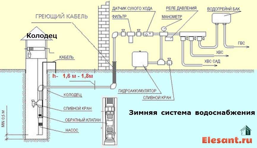 Le tuyau dans la zone au-dessus de l'horizon de congélation avant d'entrer dans la maison doit être isolé. Dans les cas où le pipeline est posé au-dessus de l'horizon de gel saisonnier, le problème est résolu à l'aide d'un câble chauffant. Il est pratique de placer le câble électrique de la pompe dans la tranchée sous la canalisation. Si sa longueur n'est pas suffisante, le câble peut être « tendu ».