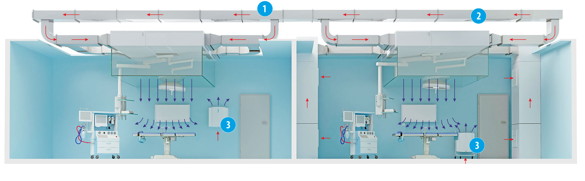 Le rideau d'air pour la salle d'opération fonctionne mieux lorsque la hotte fait le tour du périmètre de la pièce. L'avantage du système de rideau d'air est qu'il n'est pas nécessaire d'installer un système de ventilation encombrant, et les flux d'air, lorsque l'équipement est correctement placé, couvrent la table chirurgicale et le personnel médical qui y travaille.