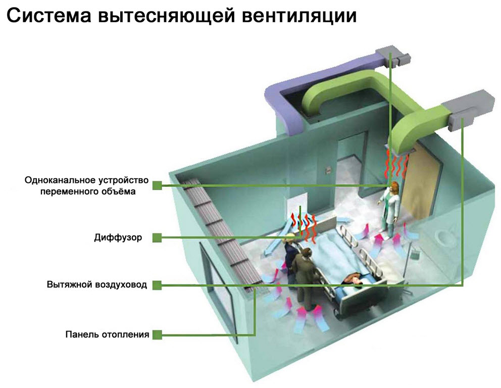 L'évacuation de l'air évacué doit être effectuée au-dessus du niveau du toit de 0,7 mètre et, après nettoyage avec des filtres, il peut être projeté sur la façade du bâtiment. L'air est fourni et prélevé dans le service et les autres pièces nécessairement dans la zone supérieure. Les exceptions sont les salles d'opération et les salles de radiologie, dans lesquelles l'entrée et la sortie d'air doivent être effectuées à partir des zones supérieure et inférieure.