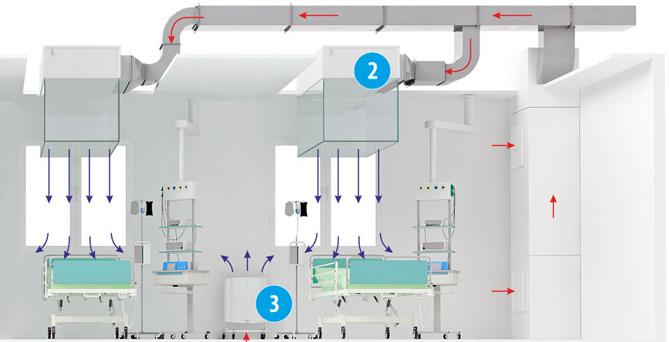 3. Dans les salles d'opération, dans la salle de radiologie, la maternité, l'unité de soins intensifs et d'autres unités importantes, la ventilation par aspiration doit être organisée de manière à ce que l'air extrait soit évacué à la fois dans les parties supérieure et inférieure de la pièce.